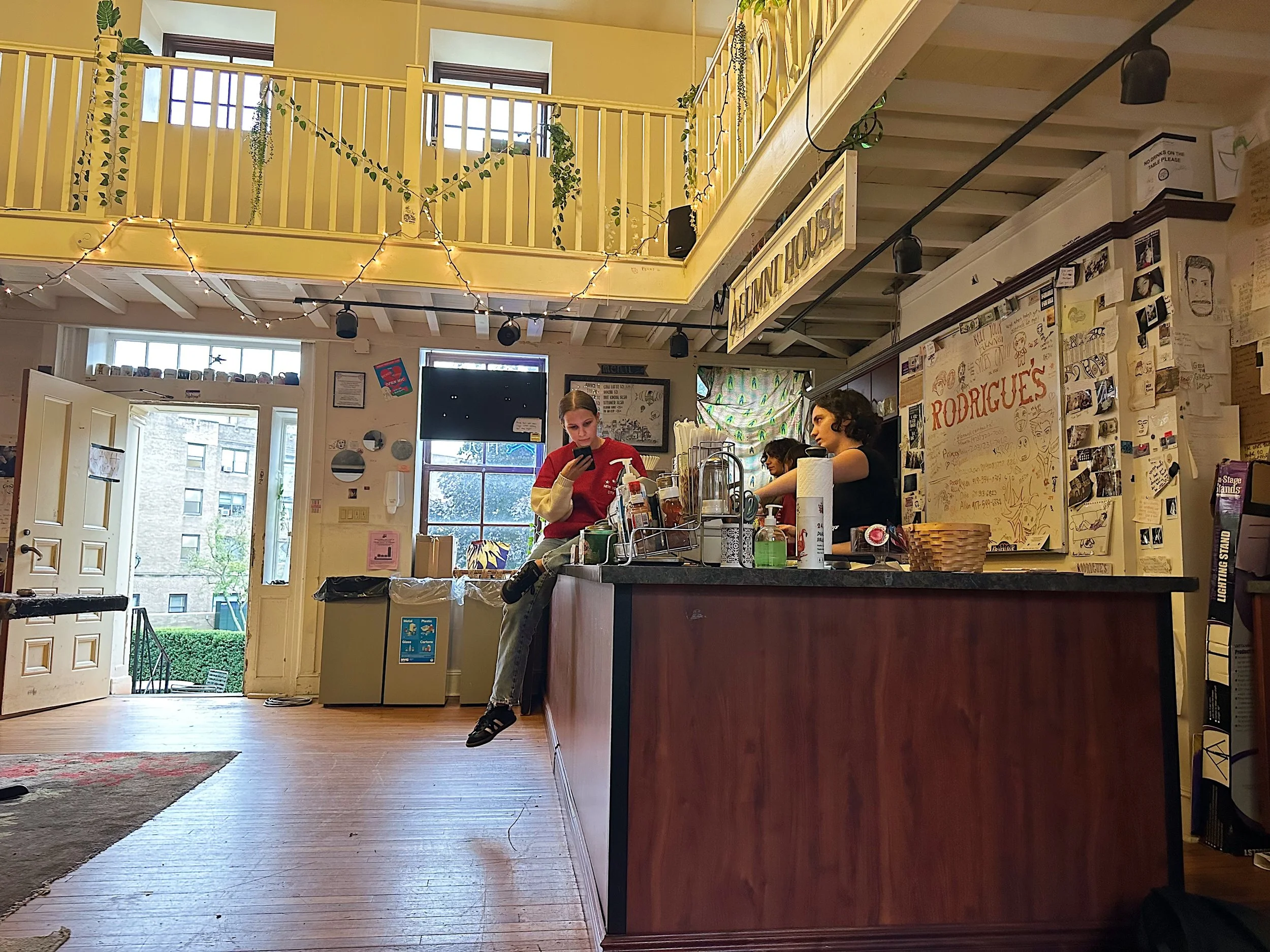 Jordan Gomes, a Fordham University Junior, perches on the shop counter while chatting with friends at Rodrigue’s Coffee House. (Photo by Lily Paturzo)